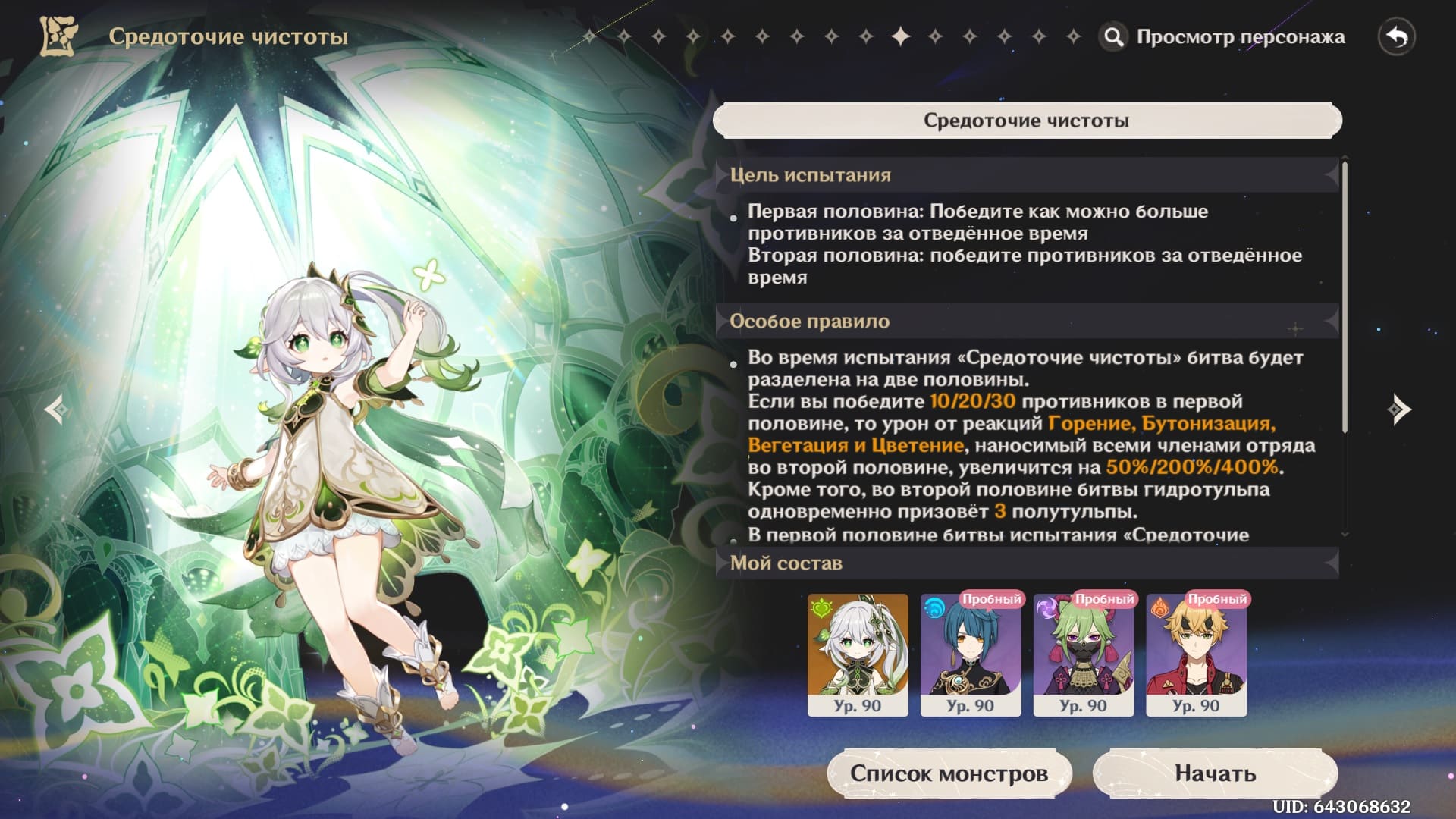 Испытание Сосредоточие чистоты Дендро Архонта проходит в два смежных этапа, которые завязаны исключительно на бою. Основным противником является Гидротульпа, обладающая иммунитетом к Гидро урону, а также получающая дополнительные усиления за счёт формирования на поле боя более маленьких версий самой себя. Для прохождения испытания в отряд к Нахиде добавляются участница банды Синобу, мечник Син Цю и домохозяин Тома.