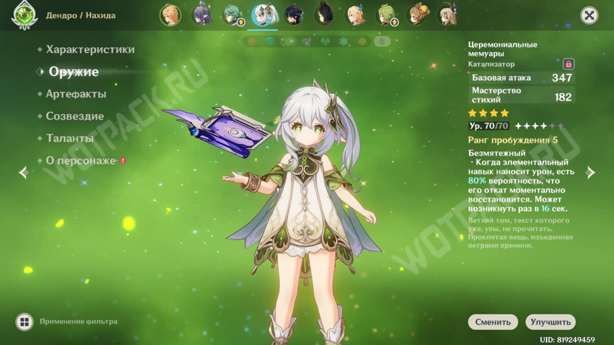 - Если почувствуете, что не попадаете в тайминги навыка Нахиды, можно воспользоваться Церемониальными мемуарами с высоким пробуждением.