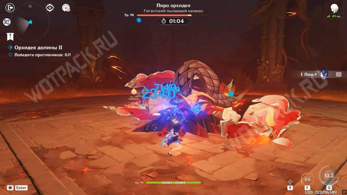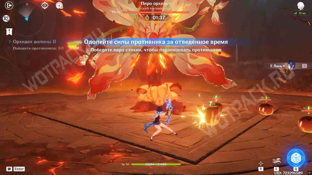 - Когда орхидея упадет, то дамаг по ней значительно повысится. Постарайтесь прожать ульту Е Лань в самом начале ослабленного состояния босса, чтобы она смогла восстановиться к фазе появления венчика и барьера на корнях. По откату Е-шки пробегайте по противнику и слаймам, что скажется на скорости накопления взрыва стихии для ключевого момента.
