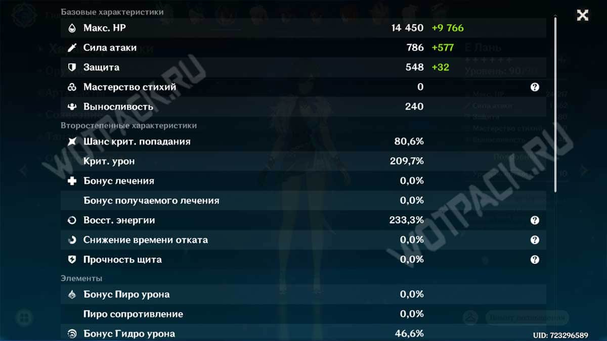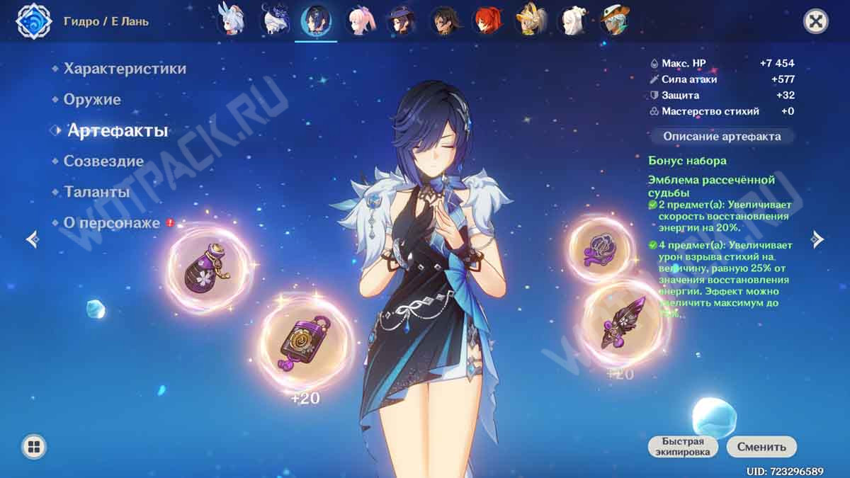 - Отдайте предпочтение сету «Эмблема рассеченой судьбы», обеспечивающему восстановление энергии и бонус к дамагу ульты. Корону следует рассмотреть на К/Ш, чтобы приблизиться к значению 65-80%. В качестве аналогов можно поставить 2×2 на HP (Стойкость Миллелита/Сияние Вурукаши) и скомбинировать с Гидро артефактами (Сердце глубин/Сон нимфы). Комфортное значение ВЭ — 210%.