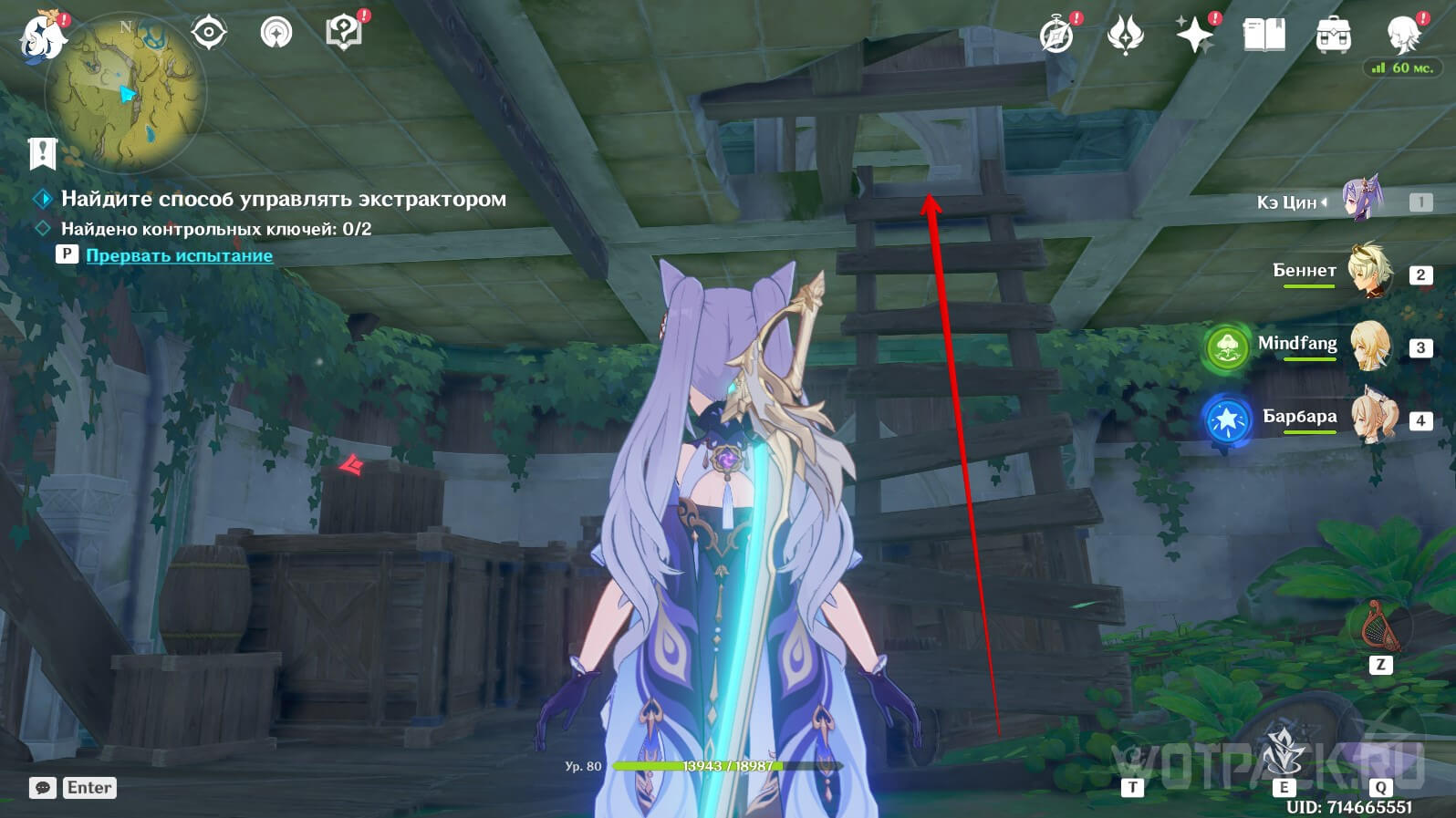 Чтобы получить первый контрольный ключ, пройдите к указанной на скриншоте точке. Там будет проем. Спрыгните в него и победите появившихся мобов, затем поднимитесь по лестнице. В конце коридора увидите маркер.