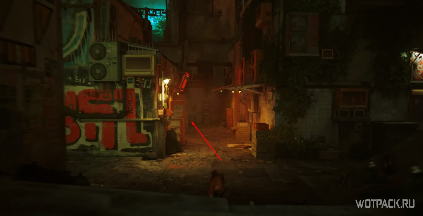 Найти последний автомат сложнее всего, снова отправляйтесь ко входу в Трущобы. На этот раз необходимо пройти в развилку с красной неоновой вывеской.