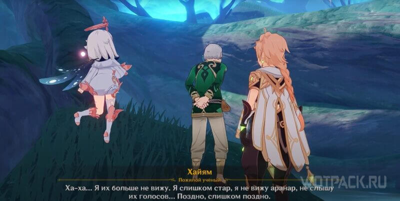 Пожилой ученый имеет проблемы с памятью, поэтому Паймон расскажет ему, что они те самые джавансы, отважные и молодые герои. Хайям поинтересуется, помнят ли его аранары, и выразит огорчение, что больше никогда не сможет их увидеть.