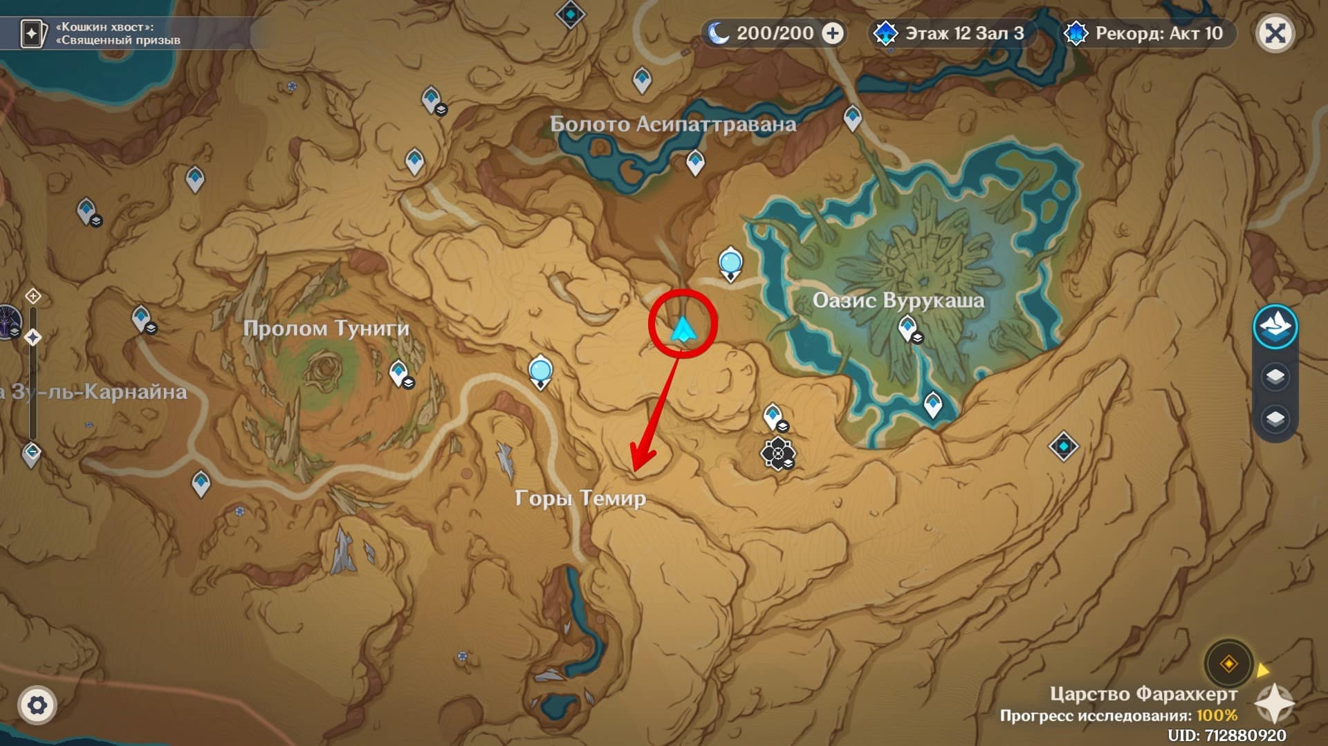 Область поиска подсвечивается и находится в пределах локации Горы Темир.