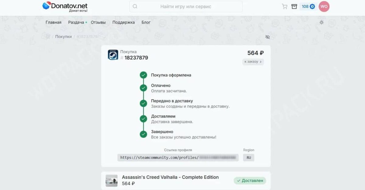 Купить игру в Стиме подарком можно при помощи сайтов-посредников, оказывающих подобные услуги. Например, donatov.net — сервис имеет хорошую репутацию, быструю доставку и отзывчивую службу поддержки. Мы проверили способ и в инструкции пошагово разберём процесс: