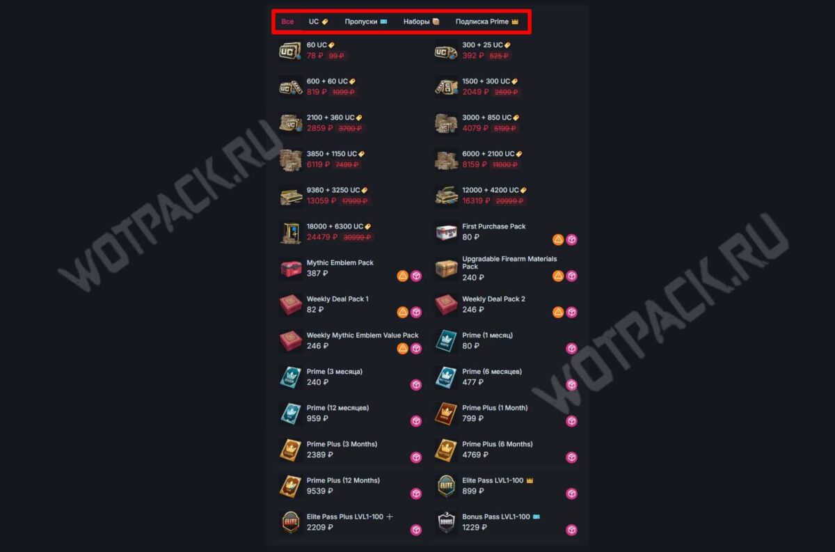 - Определитесь с типом товара, который хотите приобрести: UC, пропуски, наборы или подписка Prime. Затем кликните на интересующий номинал валюты, период подписки или уровень пропуска. Чем больше количество монет или дней, тем выгоднее обойдется товар.
