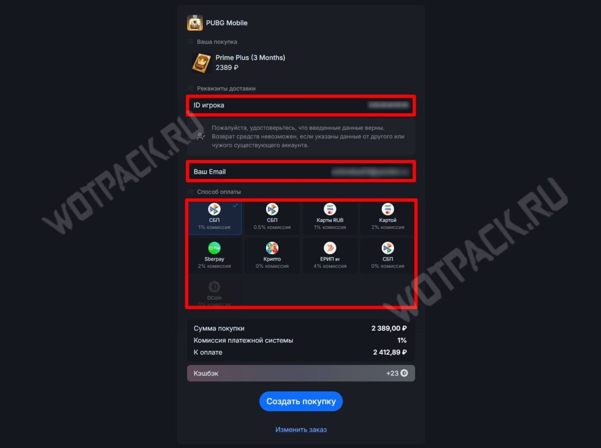 - После нажатия на кнопку «Купить» понадобится проверить корректность реквизитов доставки, а также указать электронную почту, с помощью которой сможете отслеживать статус выполнения заказа. Напоследок остается определиться со способом оплаты: СБП, рублевые и Visa/Mastercard карты, SberPay, криптовалюты или ЕРИП для граждан РБ. Выбрав удобный метод, жмите «Создать покупку».