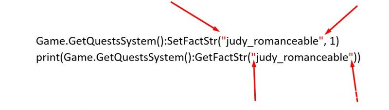Game.GetQuestsSystem():SetFactStr(«judy_romanceable», 1)