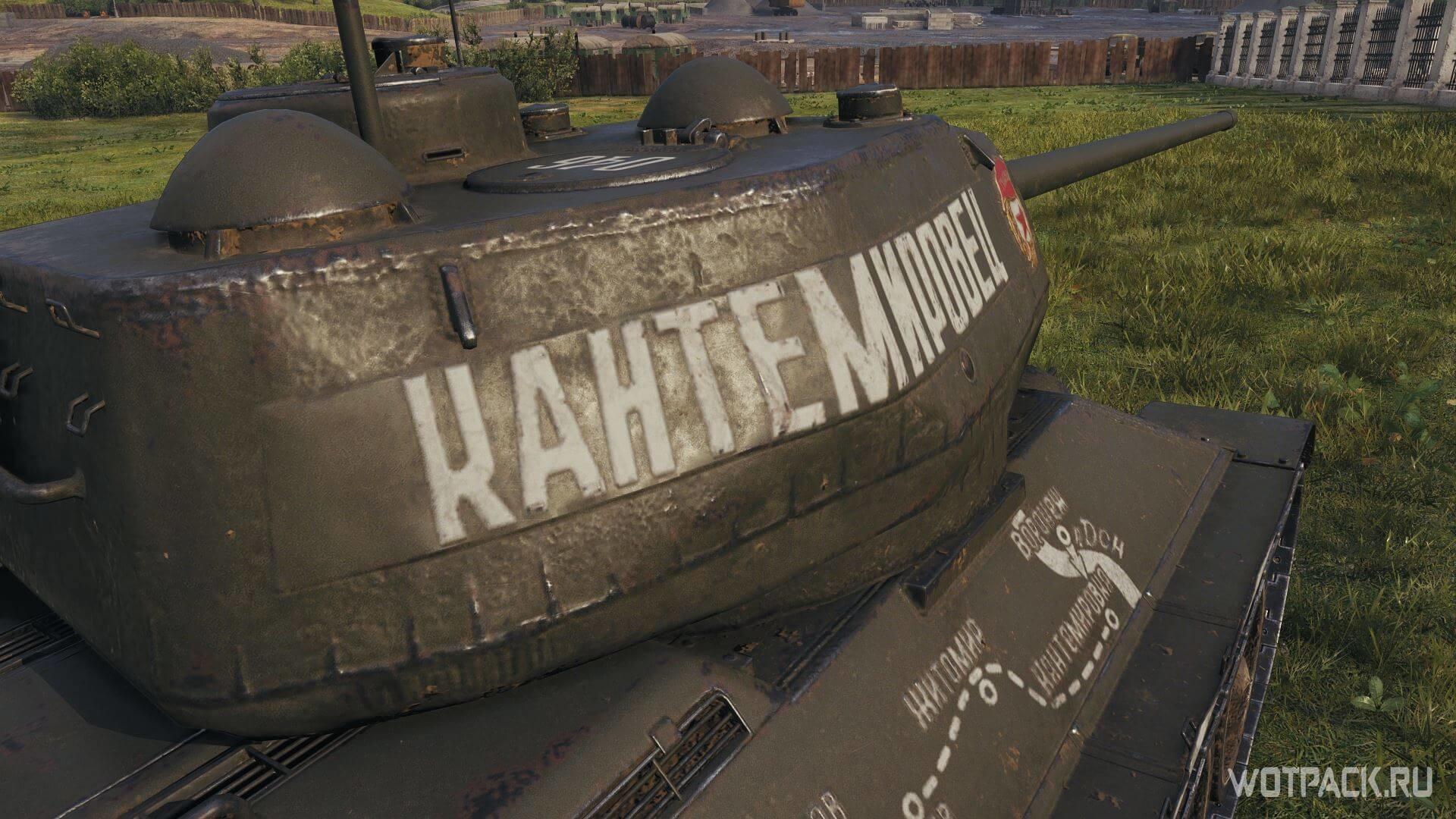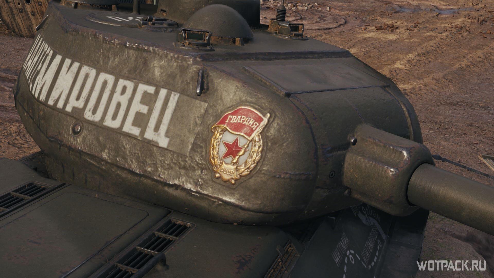 На башне машины можете увидеть номер и эмблему дивизии, а по бокам лента с названием танка. Рядом с собственным именем машины знак «Гвардия», что подчеркивает его принадлежность к гвардейскому корпусу.