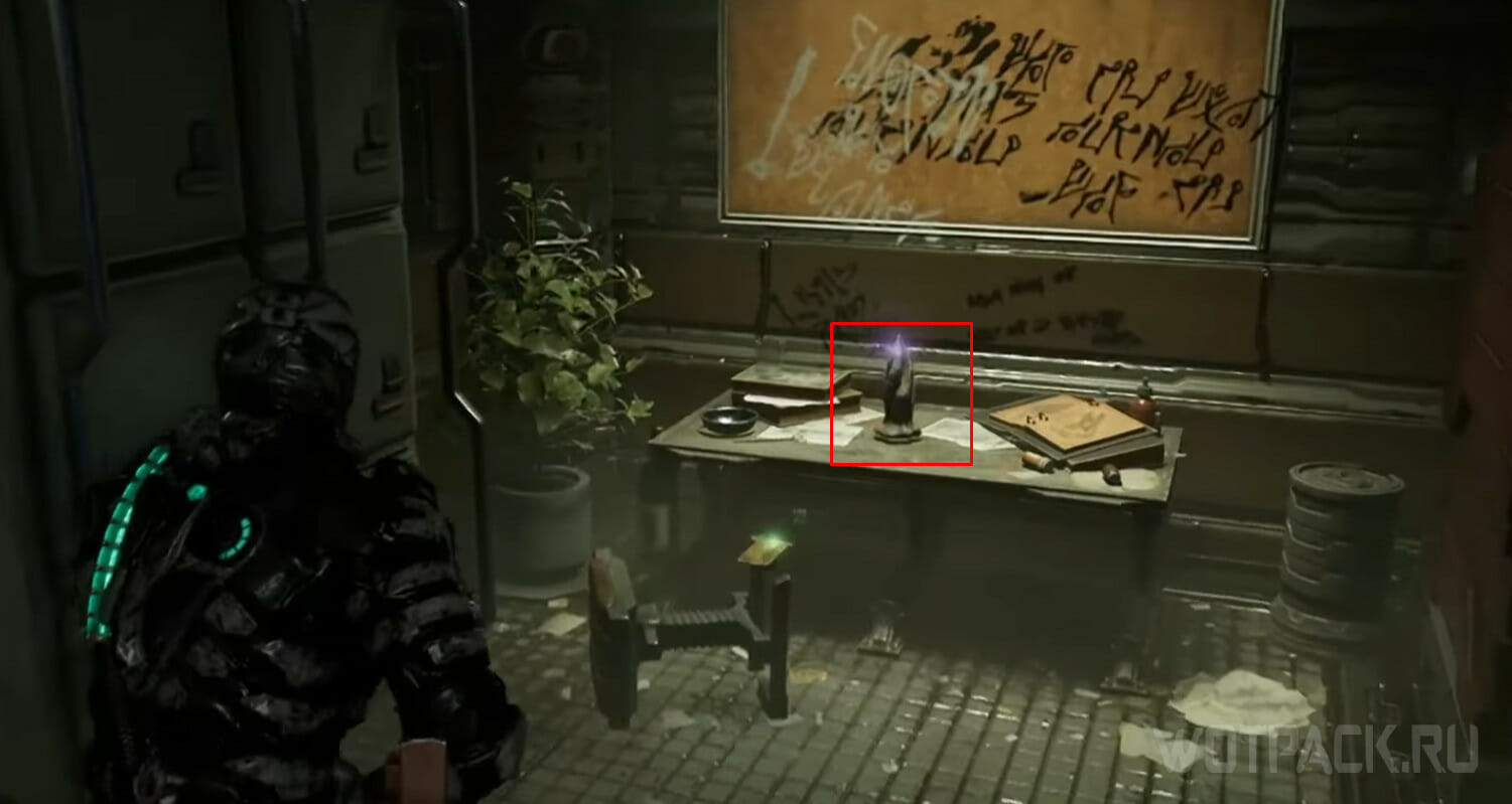 На столе, за которым висит мутант, стоит еще один обелиск. Также рекомендуем обыскать комнату для получения полезных расходников.