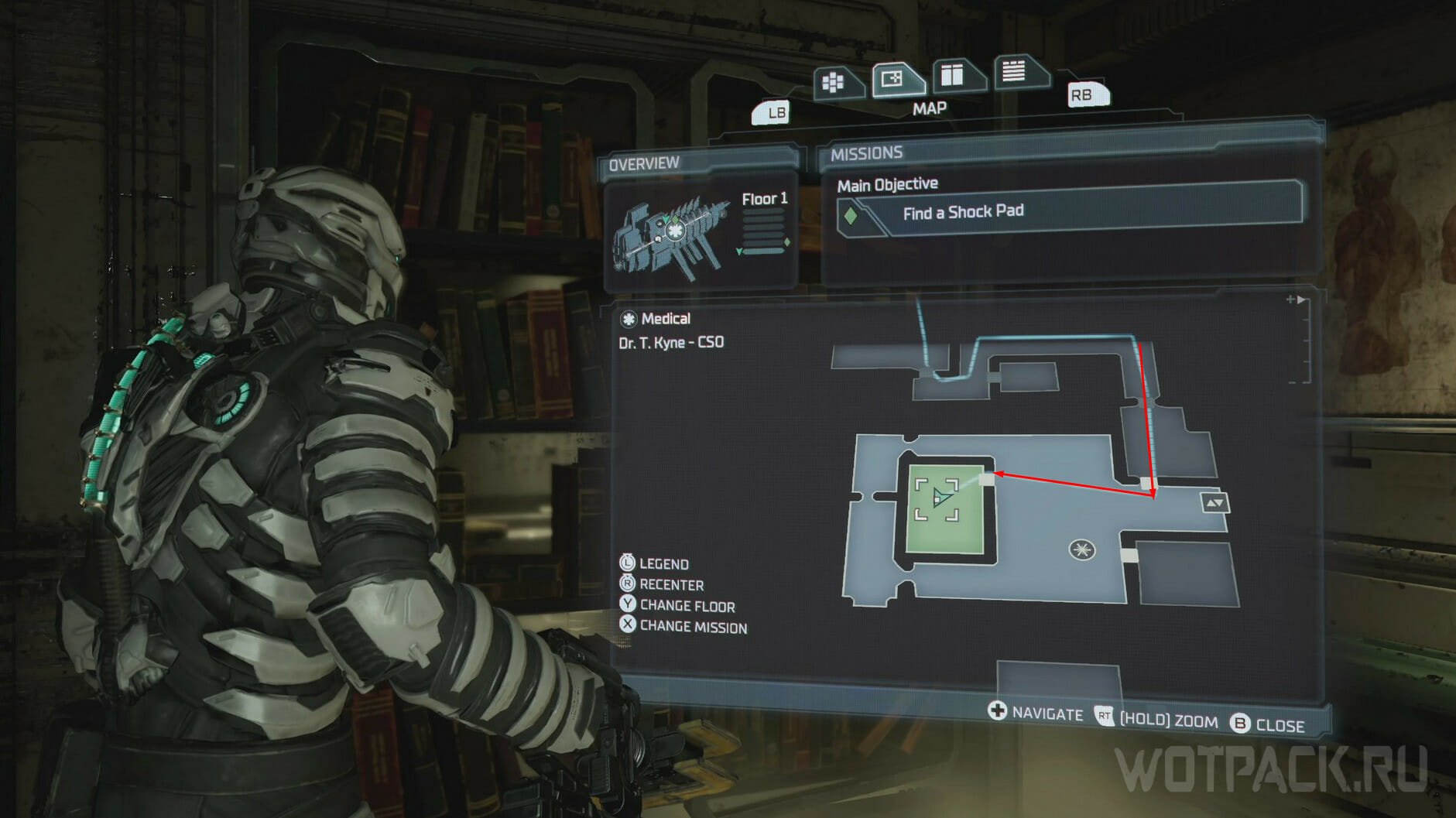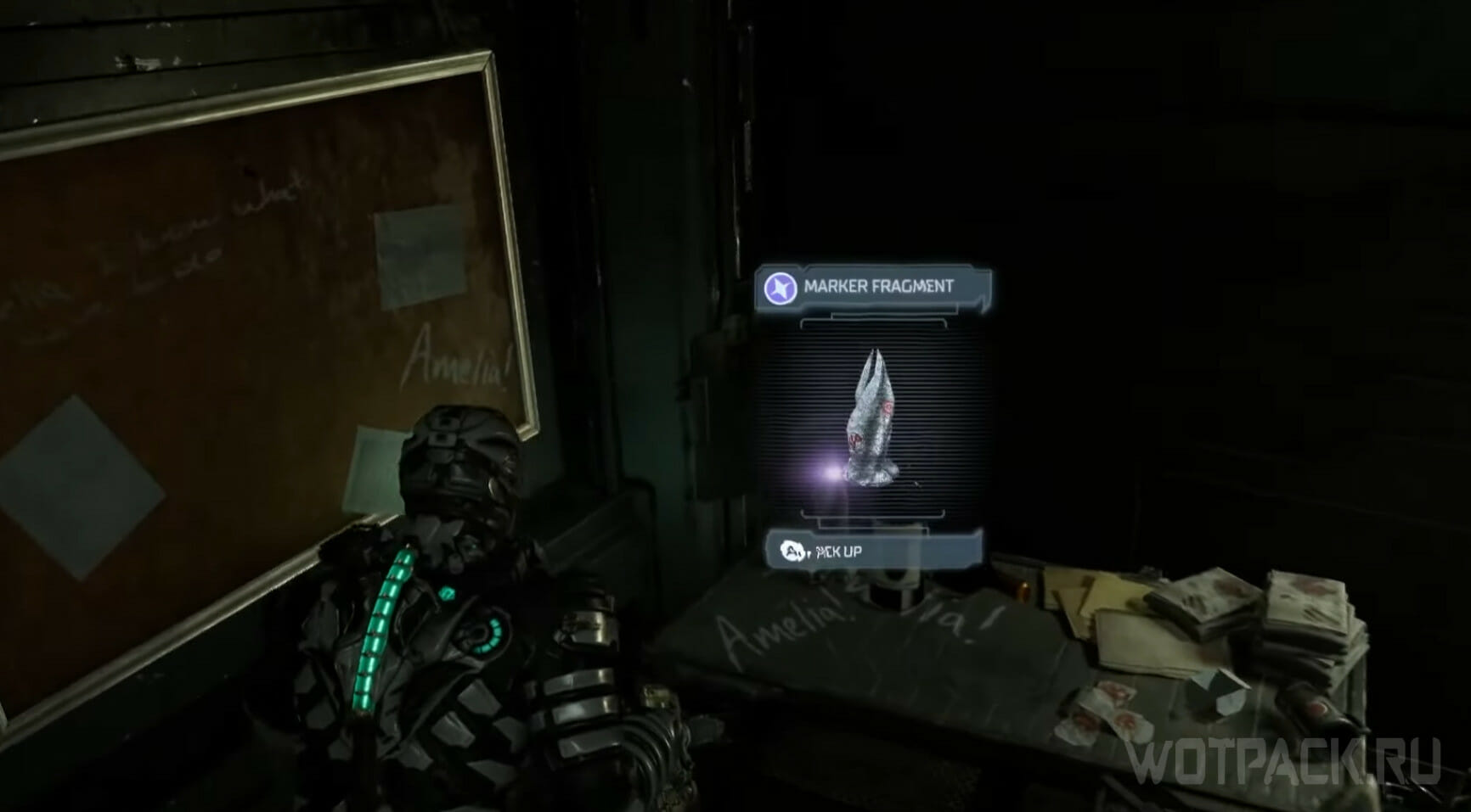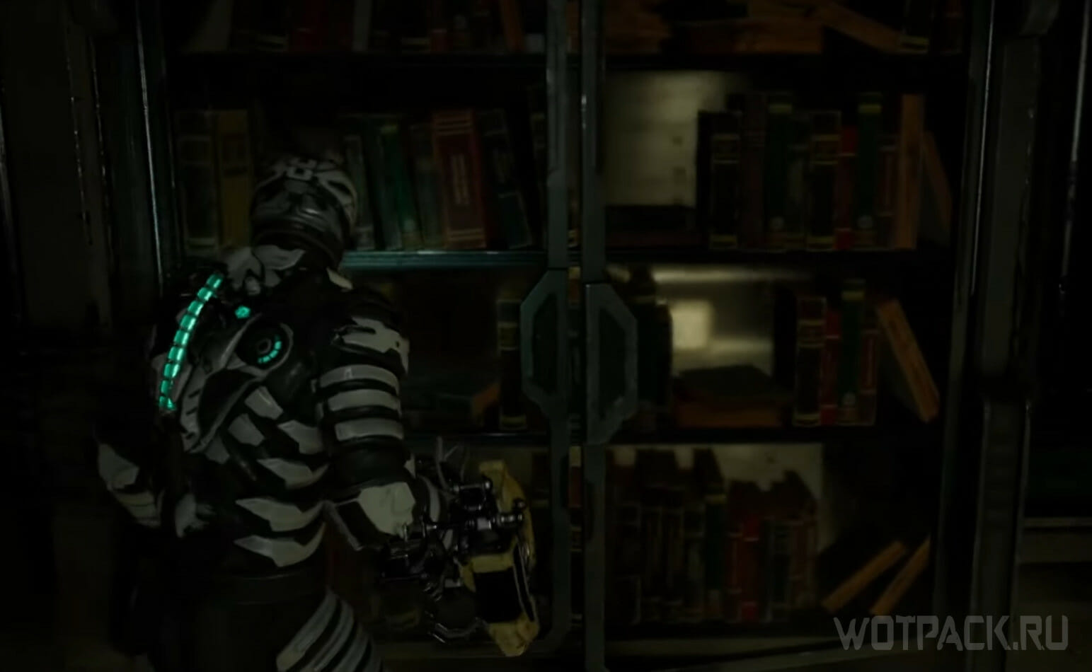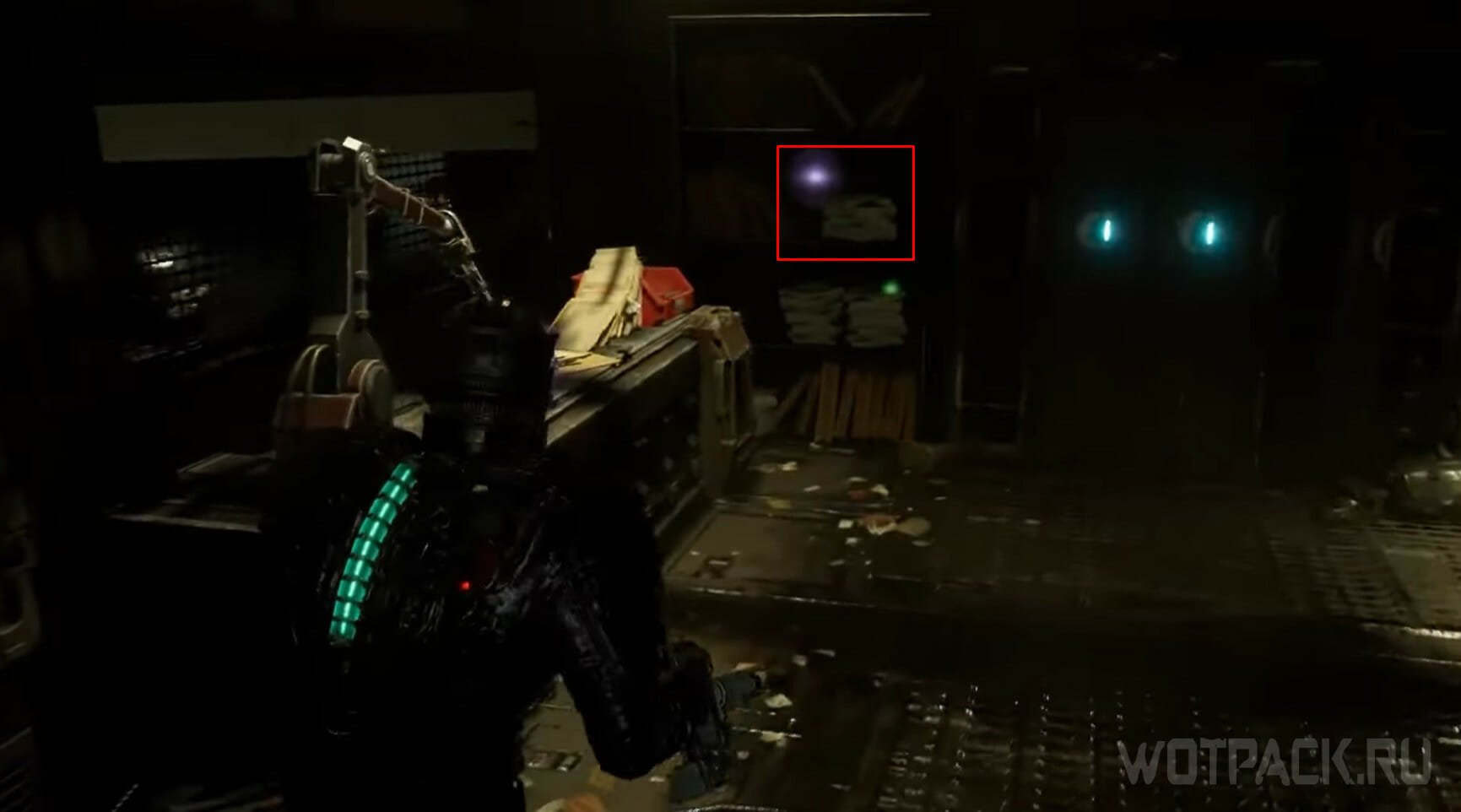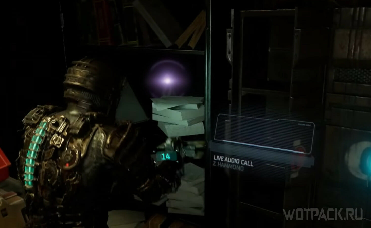 Зайдя в комнату, сразу сверните налево и подойдите к книжным полкам. Издалека заметите фиолетовое свечение. Разрушьте все мешающие объекты (стопки бумаг) и заберите первый фрагмент маркера в Dead Space Remake.