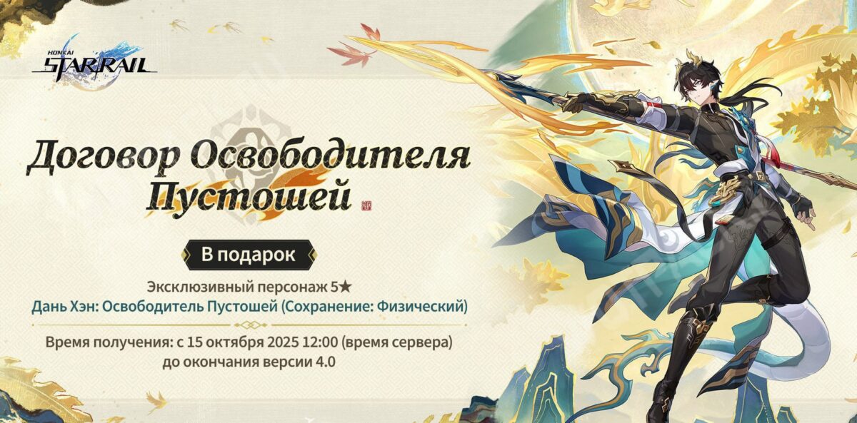 Со старта второй половины обновления 3.6, с 15 октября 2025 года до 27 января 2026 года включительно также удастся забрать новую легендарную форму Дань Хэна: Освободитель Пустошей. Письмо с героем придет на игровую почту и будет доступно весь указанный период.