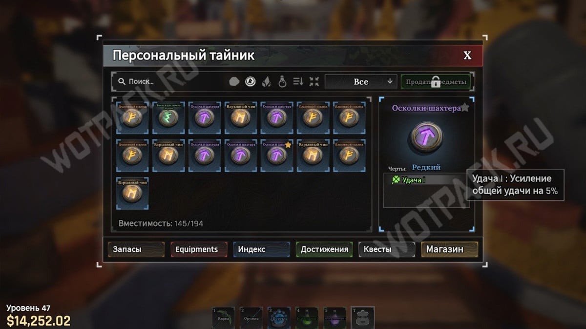 Через услуги указанного мастера можно также освобождать занятые ячейки в снаряжении.