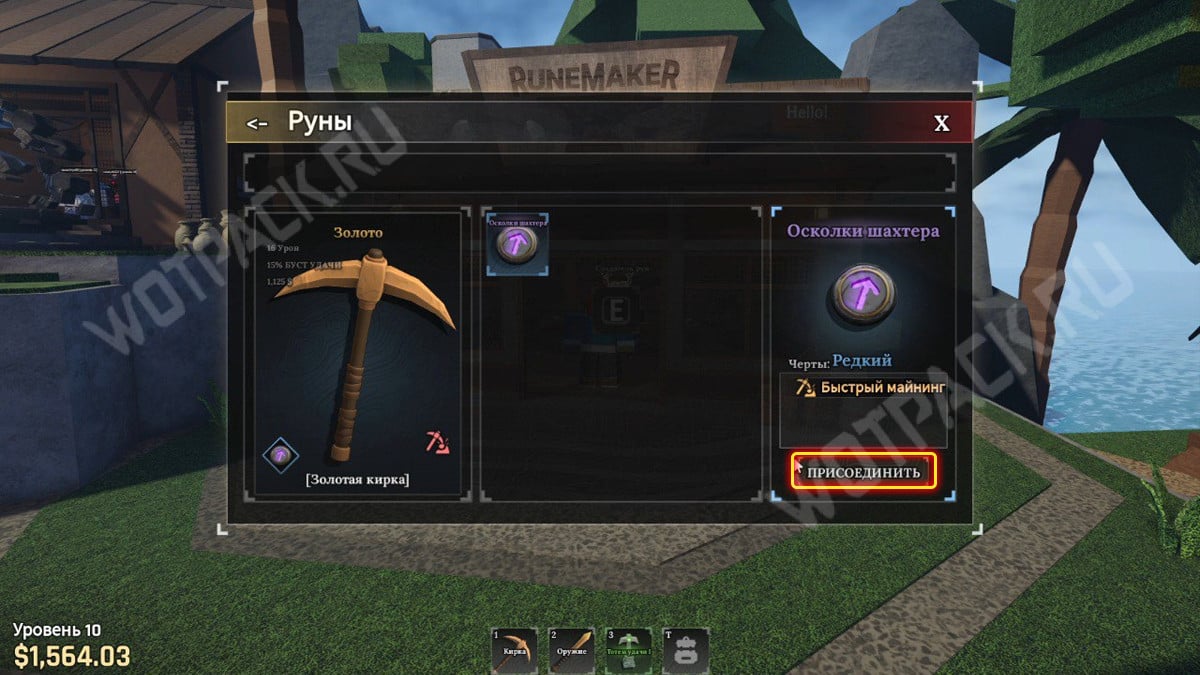 Чтобы вставить руну в доспехи, оружие или кирку, необходимо