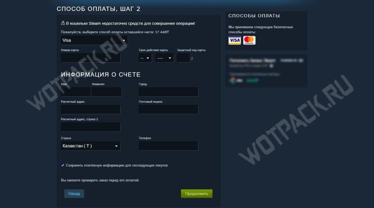 Теперь остается указать данные в Steam и приобрести игру при помощи Visa.
