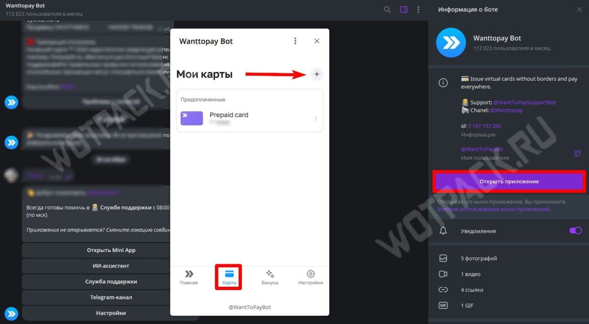- Перейдите в Telegram-бота WantToPay, откройте мини-апп и выберите раздел «Карты». В нём кликните на плюсик в верхней части окна.