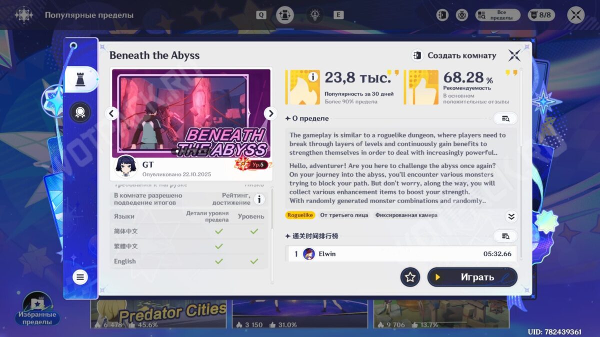 Учитывая многообразие режимов в Miliastra Sandbox, безусловно, можно натолкнуться на игры с русскоязычной локализацией, но это будет означать то, что её создатель — носитель языка, решивший опробовать свои силы в редакторе-конструкторе. Ожидать, что разработчики займутся полноценной локализацией, не стоит, так как это потребует слишком много времени и ресурсов. По этой же причине в плейсах, где изначально предусмотрен ограниченный список переводов, добавление русского текста маловероятно.