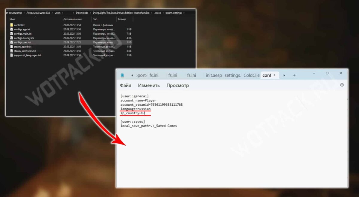 Найдите папку с игрой, перейдите в steam_settings и откройте с помощью текстового редактора файл configs.user.ini. В строке «language=english» замените параметр на «russian», а в «ip_country=US» пропишите «RU».