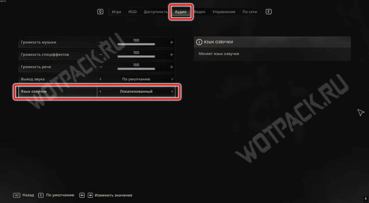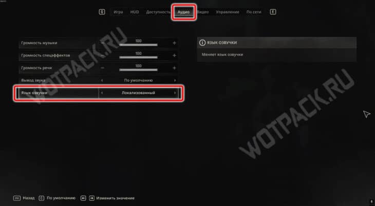 Озвучка подстраивается под интерфейс и субтитры, но её можно скорректировать во внутриигровых настройках в разделе «Аудио». Найдите соответствующий бегунок и переместите его на «Локализованный». Вариант автоматически адаптируется под языковые предпочтения приложения в библиотеке Steam и EGS или вручную выставленные параметры на неофициальных сборках — если хотите включить диалоги на русском, то остановитесь на этой опции.