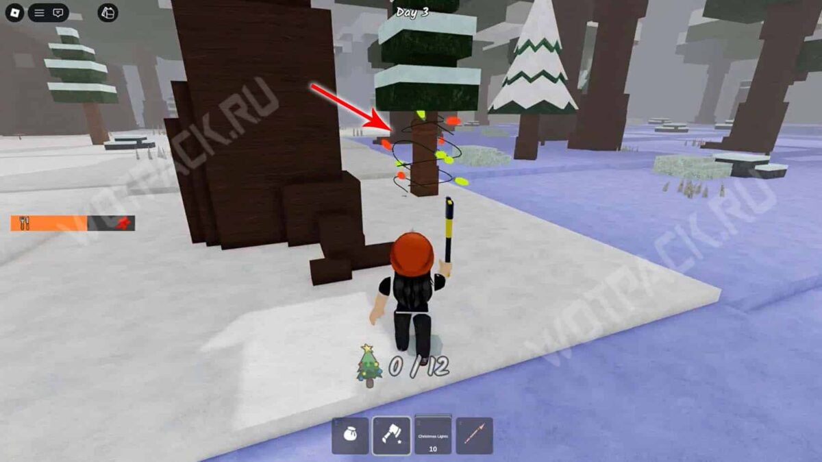 Отправляйтесь в деревню помощников Санты, расположенную неподалеку от костра, и развесьте украшения на ёлках без снега. Всего потребуется нарядить 12 деревьев, за каждое заработаете от трех до четырех сладостей. Затем мастерская возобновит работу, сможете украсить её на свой вкус тематическими постройками из чертежей.