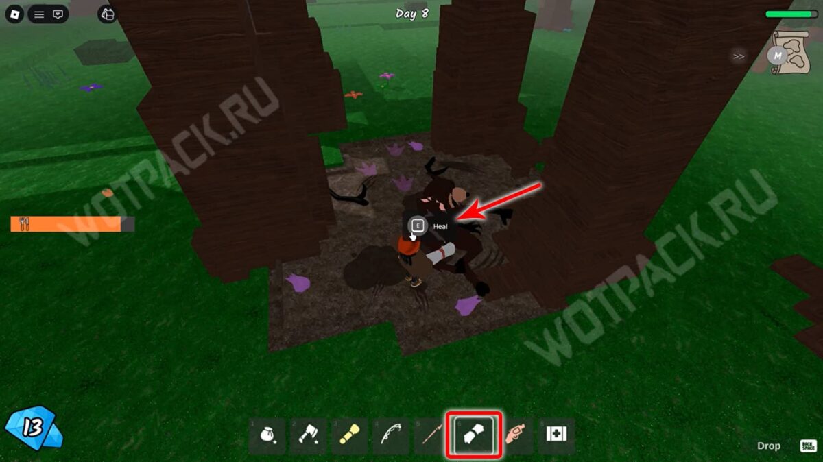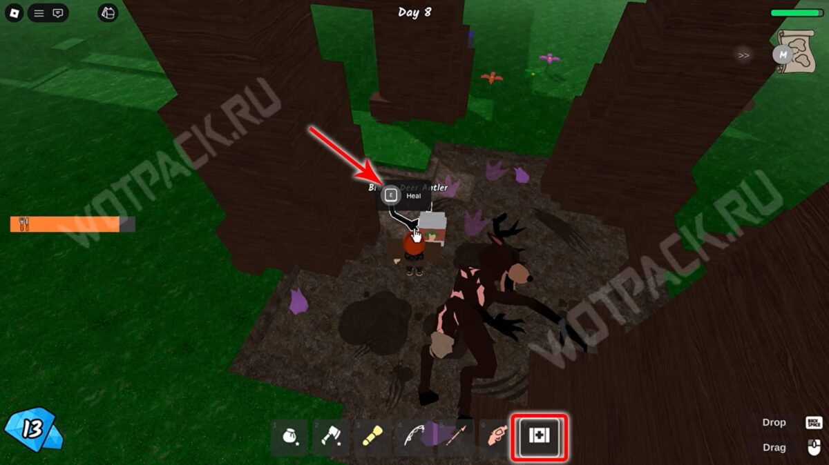 Для оказания первой помощи пригодятся бандаж или аптечка. Отыщите в окрестностях два предмета исцеления и наложите лекарства на ногу и рог оленя. После он сможет присесть на земле и начнет медленно восстанавливаться.