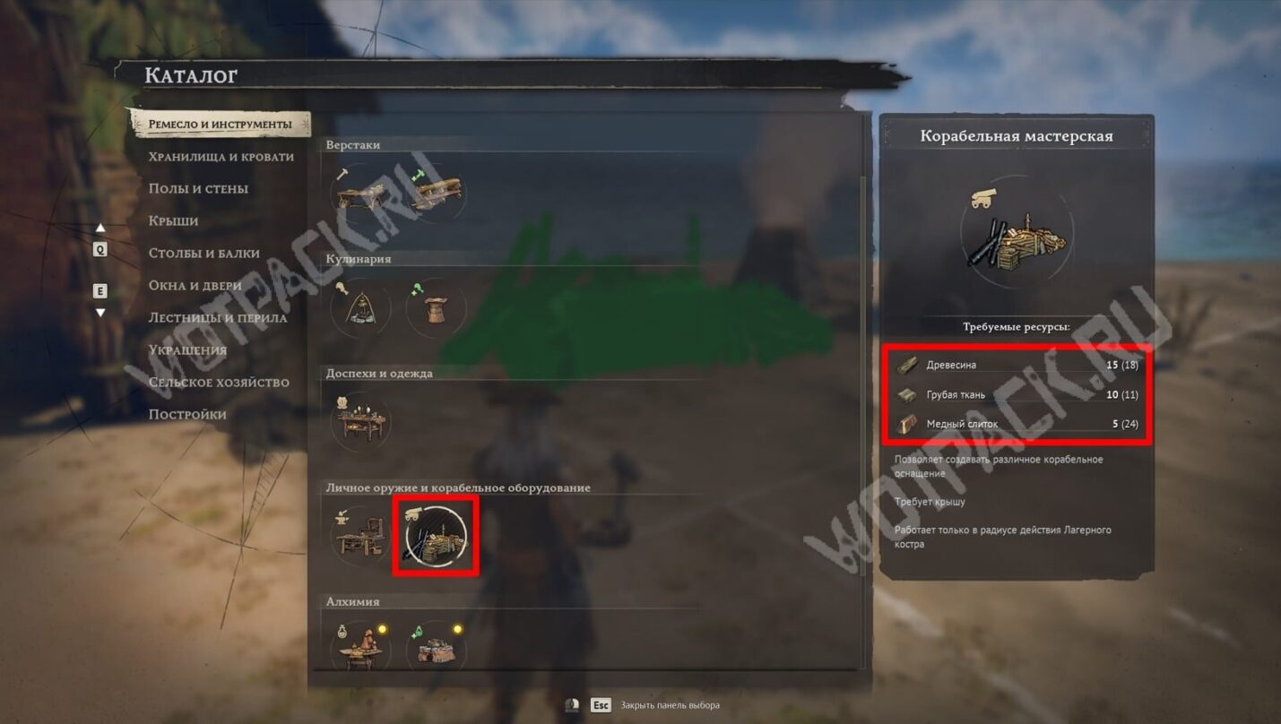 В каталоге постройки перейдите во вкладку «Ремесло и инструменты», где в категории «Личное оружие и корабельное оборудование» найдёте «Корабельную мастерскую». Для её возведения нужны: