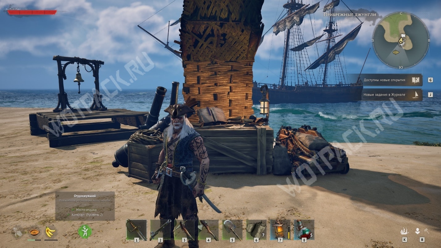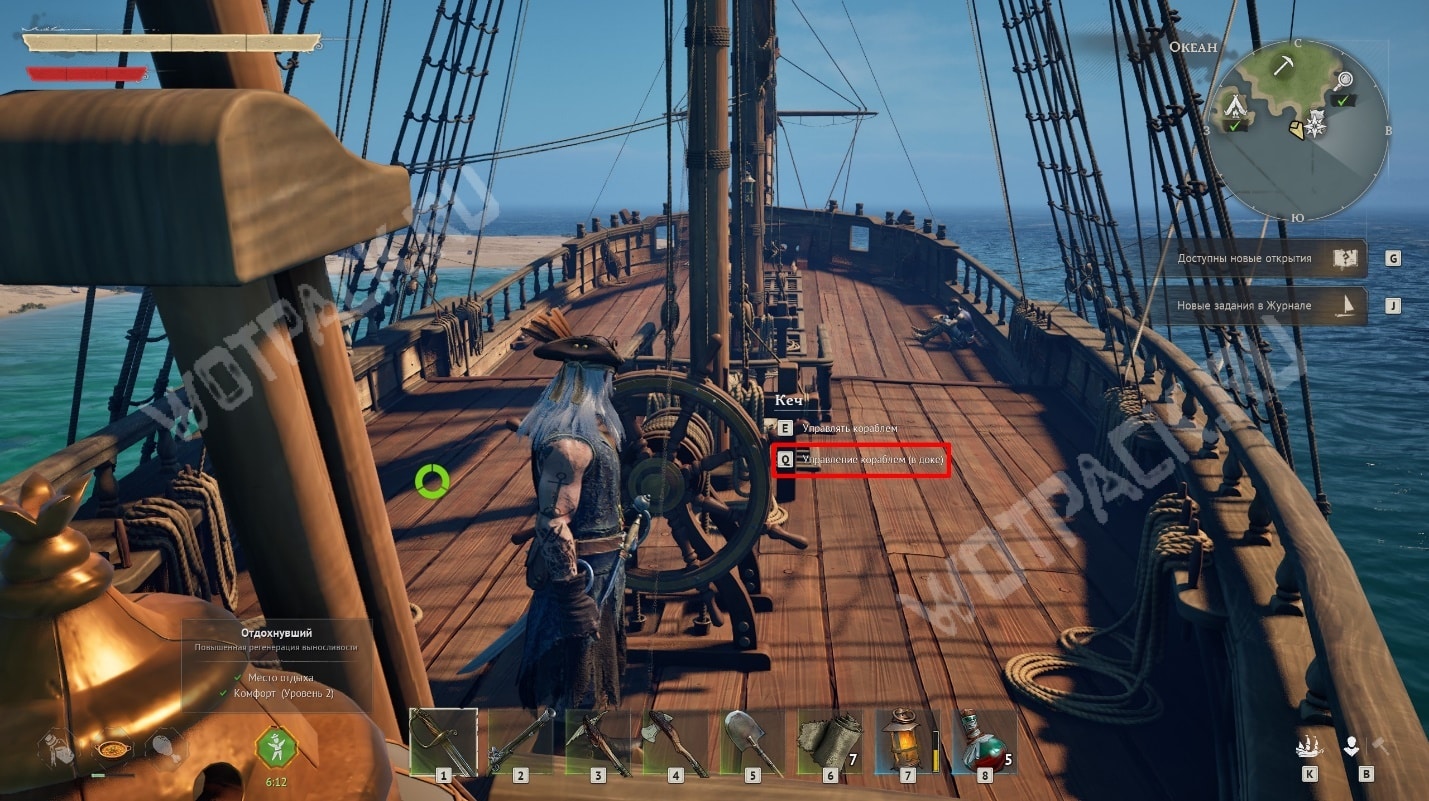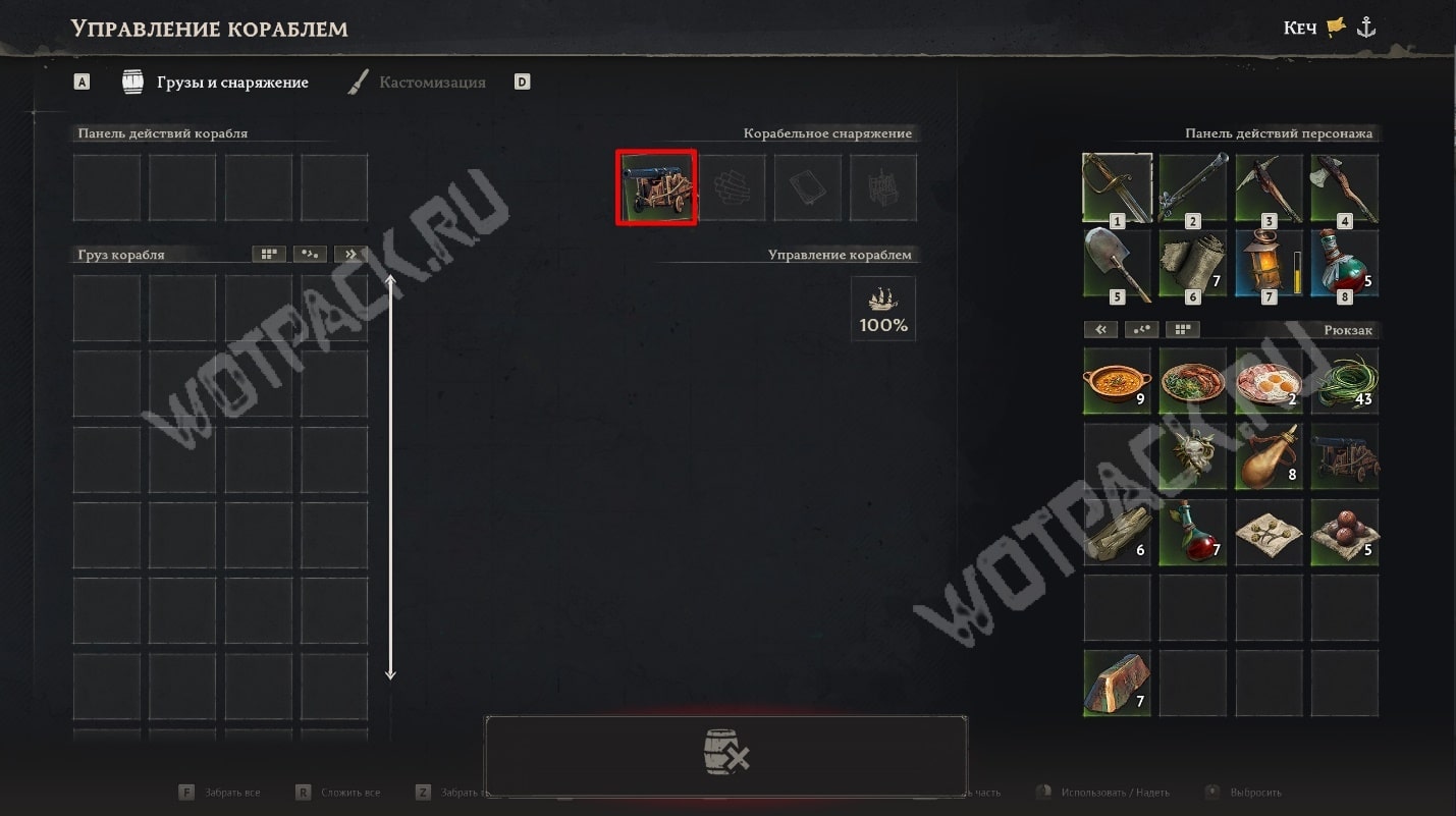 После постройки верфи нажмите на «K» и вызовите к берегу кеч. Заберитесь на судно, встаньте к штурвалу и нажмите на «Q», чтобы управлять кораблем в доке. Делать это необходимо около только что возведённого порта. Так откроете интерфейс управления судном и сможете перетащить пушки из инвентаря в слот корабельного снаряжения. Эти действия завершат основной квест.