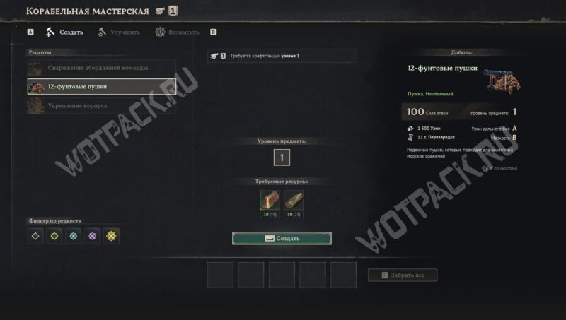 Откройте интерфейс корабельной мастерской и создайте 12-фунтовую пушку — достаточно одной штуки. Для неё нужно собрать: