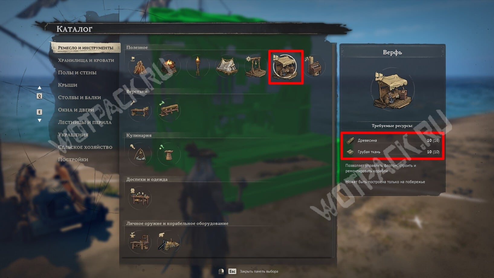 В каталоге строительства откройте «Ремесло и инструменты» — в разделе «Полезное» появится верфь со списком необходимых ресурсов: