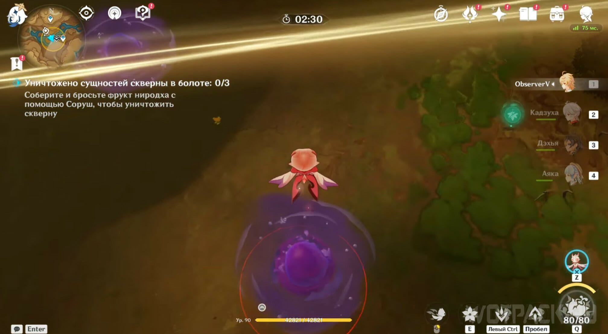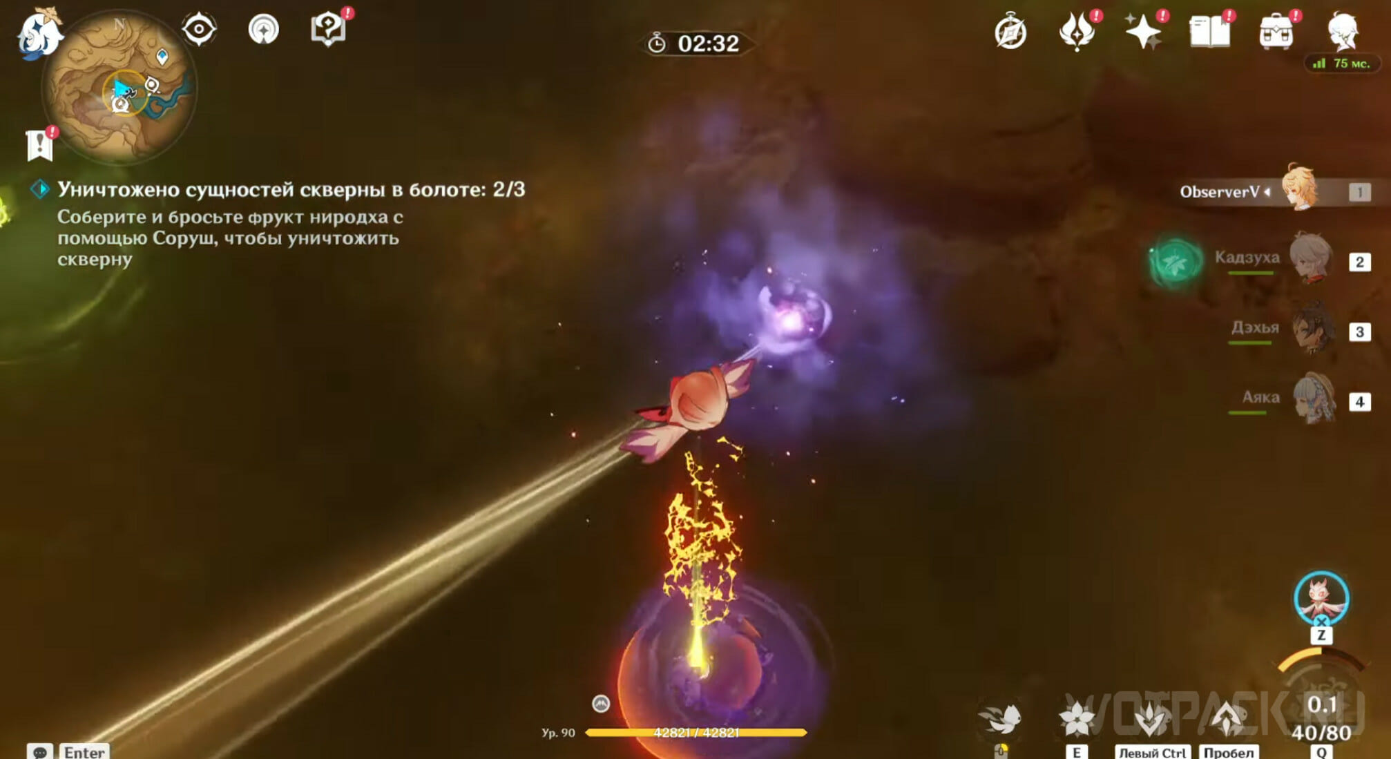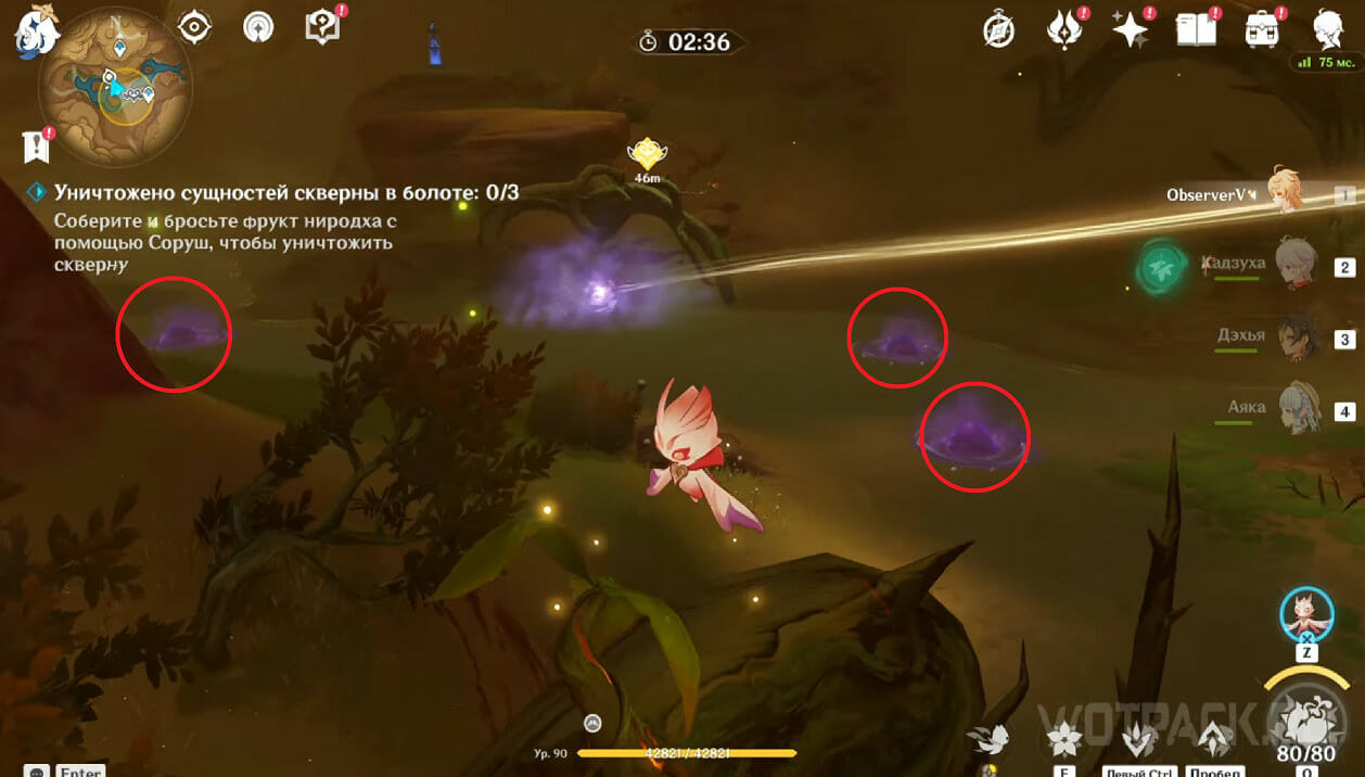 Нужно сбросить фрукт на трех сущностей. Две расположены под лучом, проходящим от Хварны шипов к туману, а одна слева, подальше от остальных. Подлетите к сущности сверху, прицельтесь так, чтобы красная область покрывала фиолетовый шарик, после чего нажмите «Q». На одну атаку расходуется 10 ед. энергии, всего их 80.