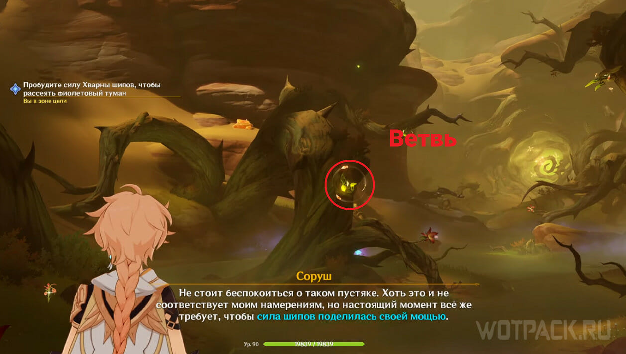 Когда Соруш проговорит свою реплику, переключитесь на нее и развернитесь. На ветке, под которой прошел Путешественник, расположена мощь Хварны шипов. Подлетите к ней и нажмите «E», чтобы пробудить. После этого на болоте снова появятся сущности.