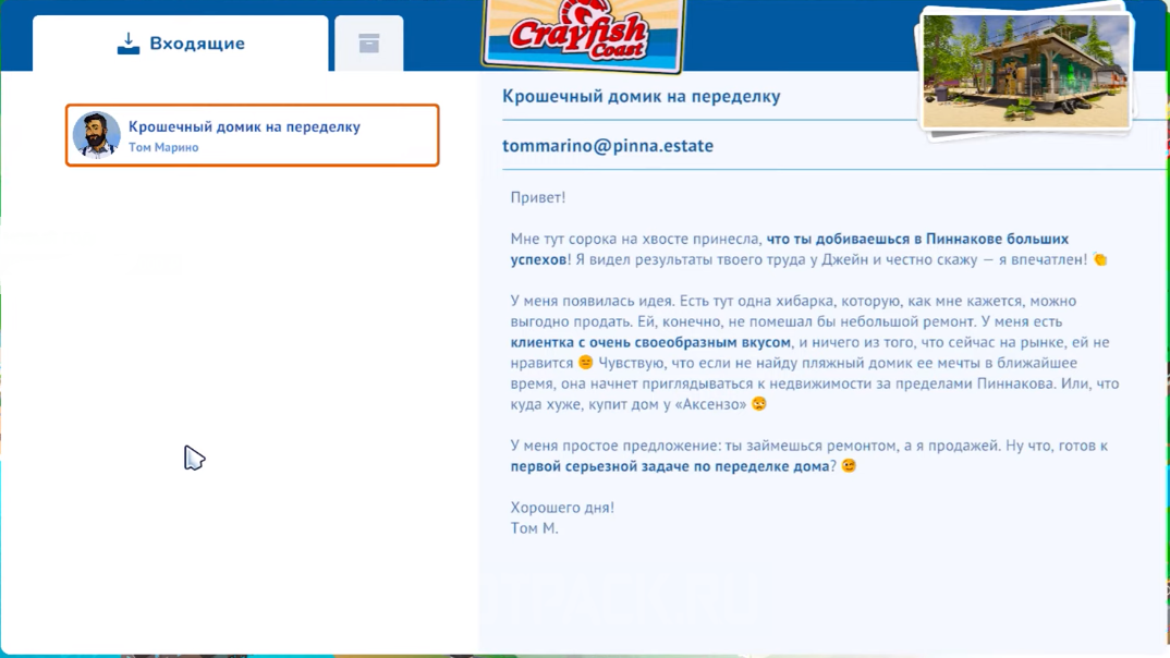 В ходе прохождения заданий от Тома Марино, столкнетесь с заказом «Крошечный домик на переделку». В рамках данного квеста предстоит починить хибару на пляже, чтобы продать ее очень требовательной клиентке. После закрытия проекта снова позвонит Том и позволит заниматься перепродажей собственных домов.
