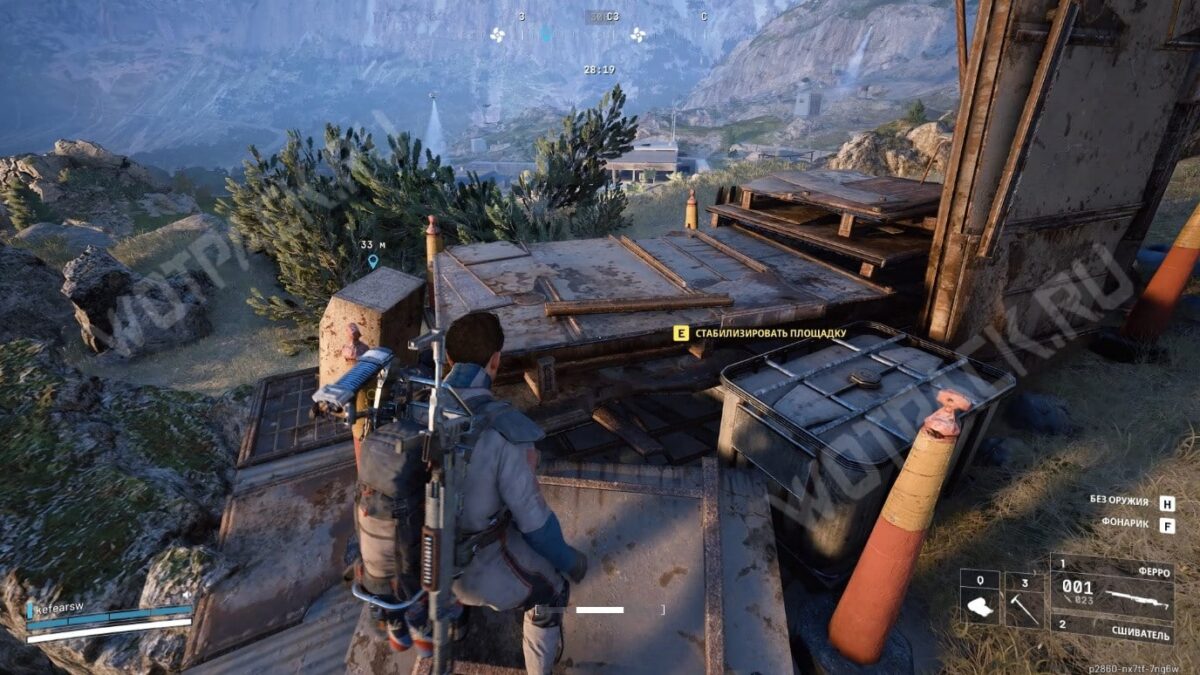 Подойдите к разрушенному строению и найдите жёлтый маркер. Убедитесь, что поблизости нет угрозы в виде роботов или рейдеров, а затем стабилизируйте площадку, нажав на клавишу «E». Это действие займёт несколько секунд, после чего можно отправляться выполнять другие задачи.