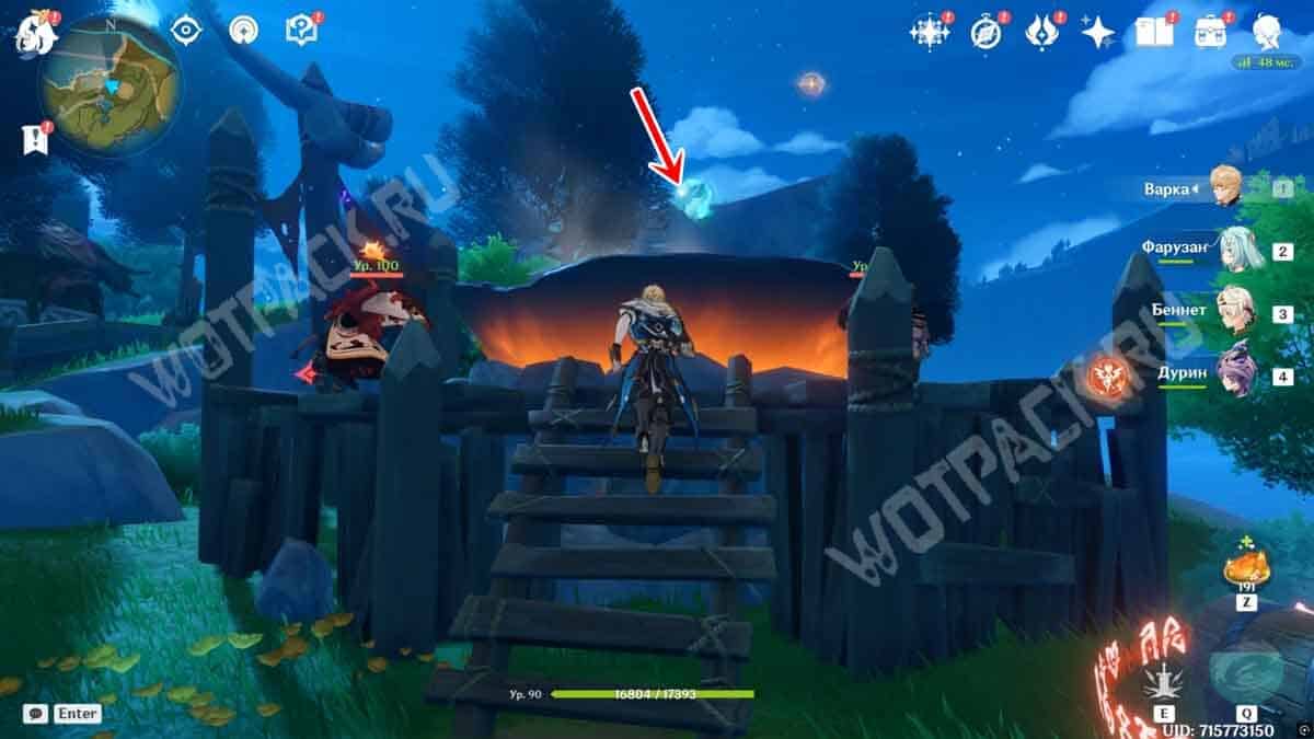 Следующая прячется в большом котле на востоке, возле арены местной легенды Чурльдрика. Победите Пиро мага Бездны и двух хиличурлов, чтобы фея улетела. Последуйте за ней в форме мотылька до озера.