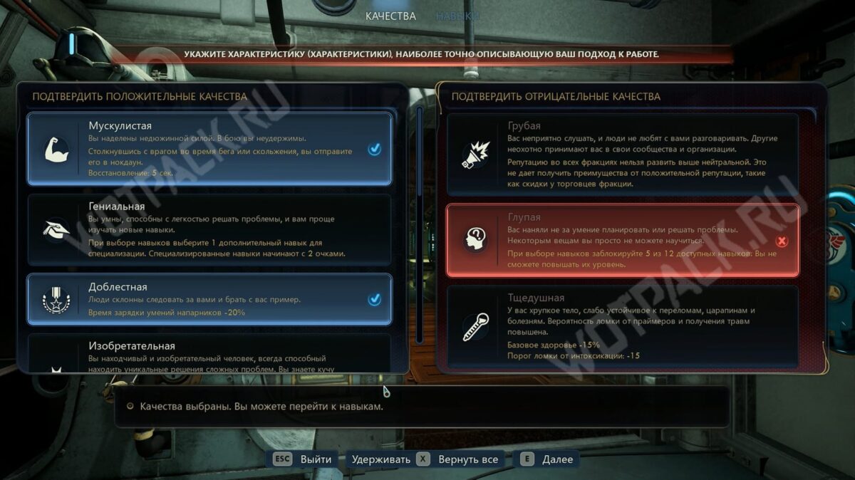 Редактор талантов будет урезан: сможете поменять лишь навыки и качества, а внешность и предысторию — нет. Даже если уверены в своем выборе, советуем перечитать другие варианты, чтобы сравнить умения между собой. В дальнейшем сбросить очки способностей не получится.