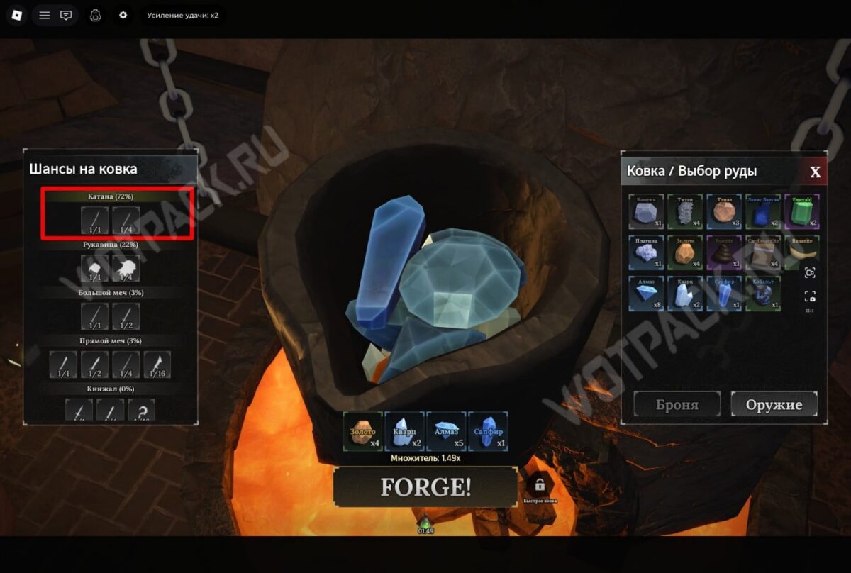 Создание катаны в режиме Ковка в Роблокс не требует большого количества материалов, поэтому обзавестись ей можно на начальных этапах. Достаточно накопить 12 кусков редкой руды и воспользоваться одним из проверенных рецептов.