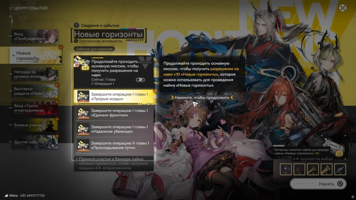 - Потратить 4 десятки разрешений на наём в событии для новичков «Новые горизонты», чтобы получить случайного стандартного 6⭐ оперативника.