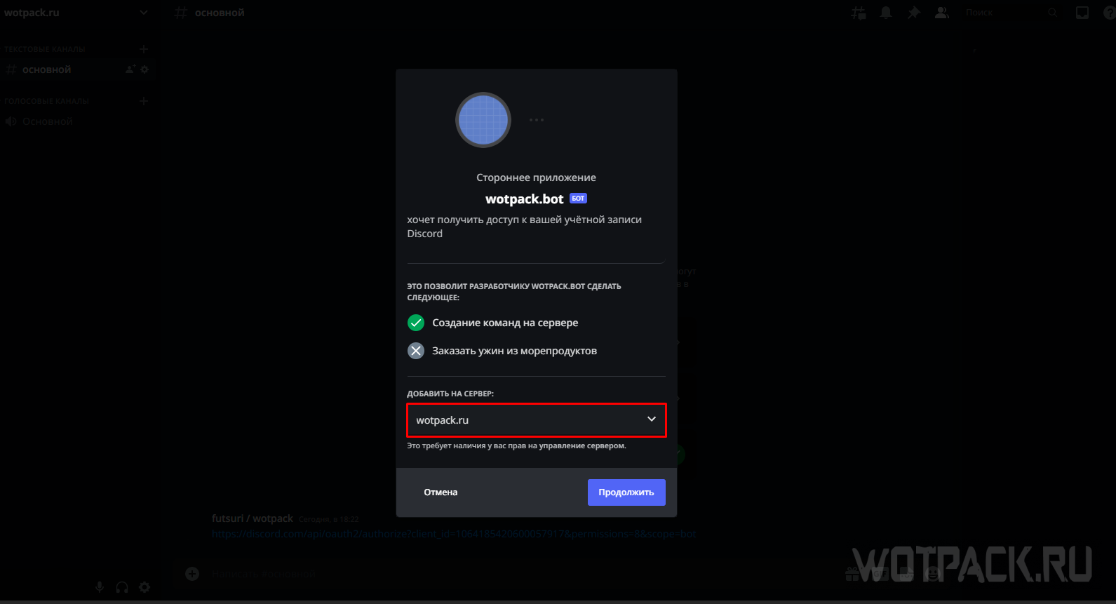Перейдите по ссылке, откроется окно авторизации бота. Укажите сервер, на который собираетесь добавить бота, после чего нажмите «Продолжить». Дискорд уточнит, разрешаете ли боту получить следующие права: нажмите «Авторизовать».