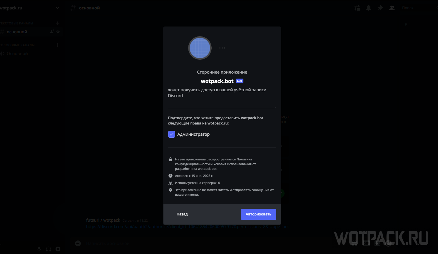 Если все прошло успешно, в чате появится уведомление о присоединении бота к серверу.