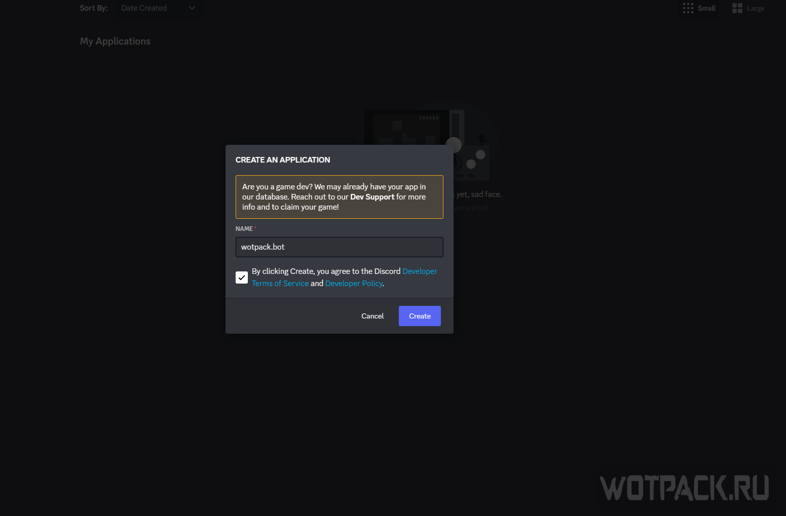 Нажмите на синюю кнопку в правом верхнем углу «New Application», откроется окошко с созданием приложения: в строке «Name» введите название для будущего бота, затем кликните «Create».