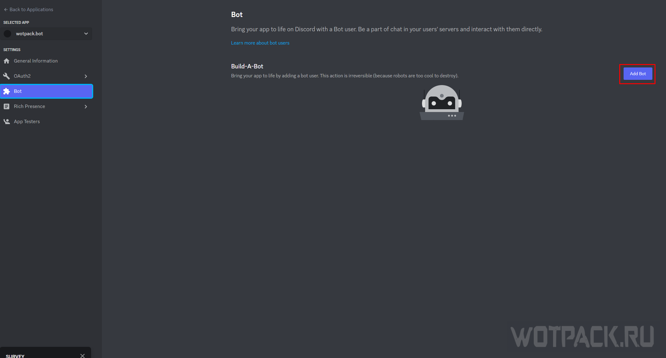 В меню слева перейдите во вкладку «Bot», после чего нажмите на кнопку справа «Add bot». Сайт выдаст предупреждение о том, что после создания бота приложение получит «публичную жизнь», принимайте и продолжайте.