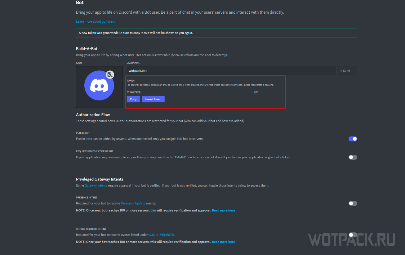 Под именем бота есть раздел «Токен». Его необходимо создать, нажав «Reset Token», после чего обязательно сохранить и записать куда-нибудь. Токен показывается лишь единожды, если потеряете его, придется пересоздавать, а этот процесс влечет за собой приостановку работоспособности бота. Нажмите «Copy» и запишите его в какое-нибудь место.