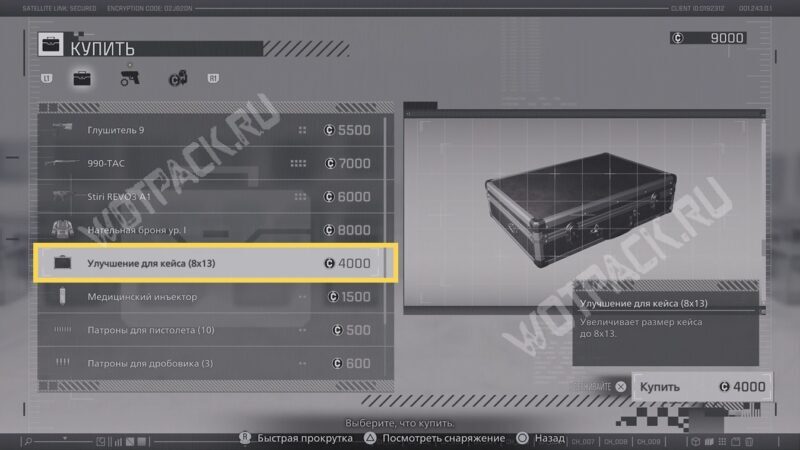 - Леону доступно разовое улучшение в процессе прохождения сюжетной кампании. После выхода в Раккун-Сити, на территории центрального лагеря, взаимодействуйте с контейнером и купите «Улучшение для кейса (8×13)» за 4 000 кредитов. Эта валюта начисляется за убийство заражённых.