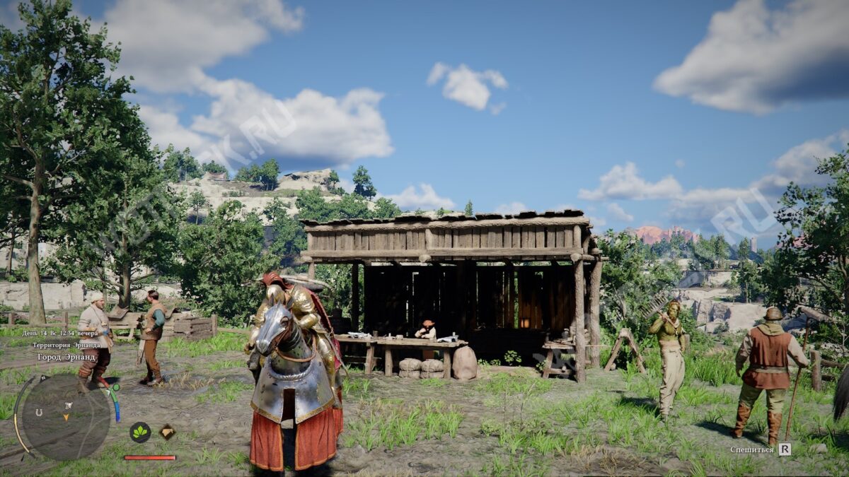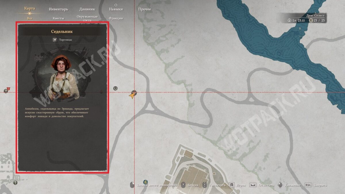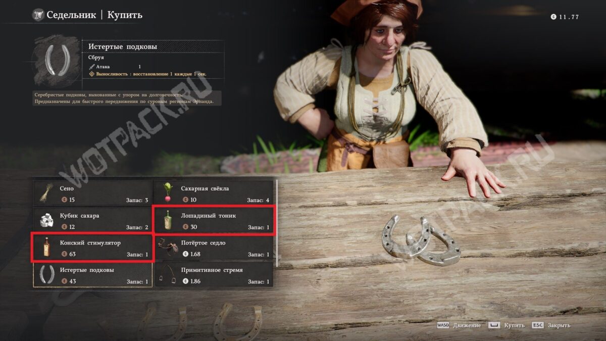 Прежде чем отправиться в долгое путешествие верхом, наведайтесь к седельнику в конюшне. В ассортименте этого торговца можно найти корм для лошади: