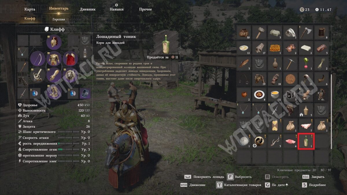 Для восстановления здоровья питомца применяются расходники, которые можно купить у специального торговца. Если мало денег, используйте более доступные средства — активируйте навык из категории «Дух» или обратитесь к конюху.