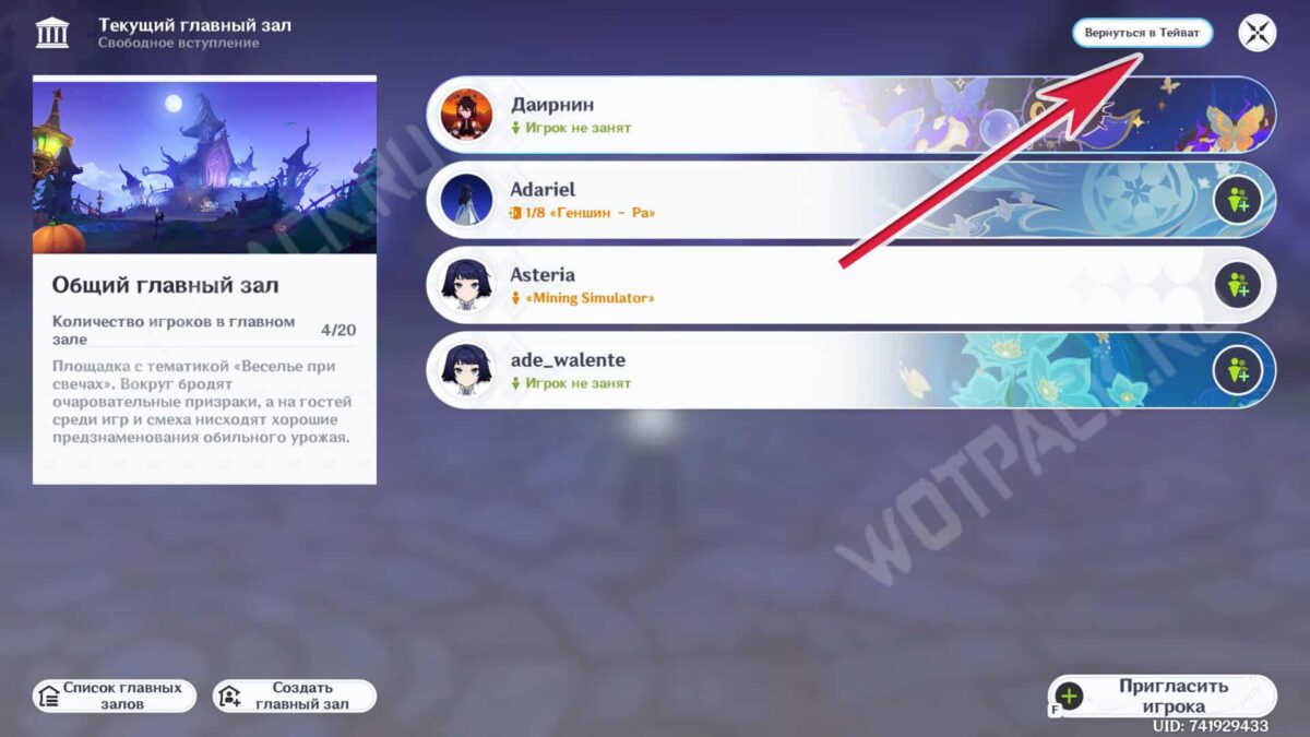 - В верхнем правом углу открывшегося окна найдите кнопку «Вернуться в Тейват» и подтвердите переход.