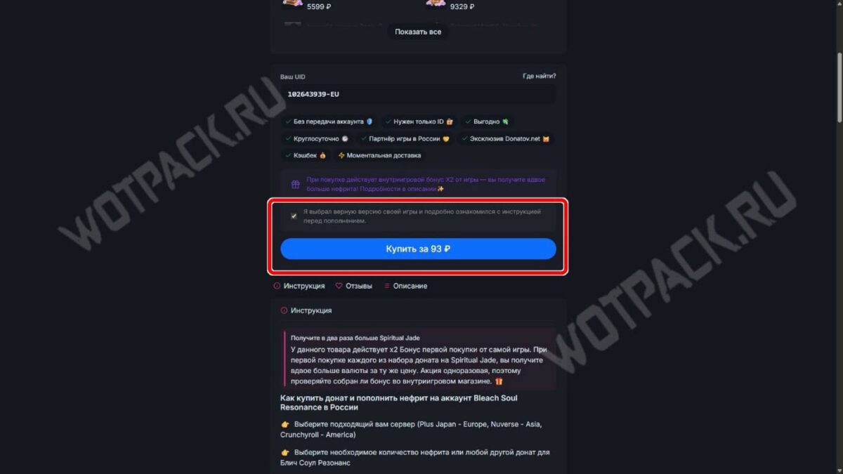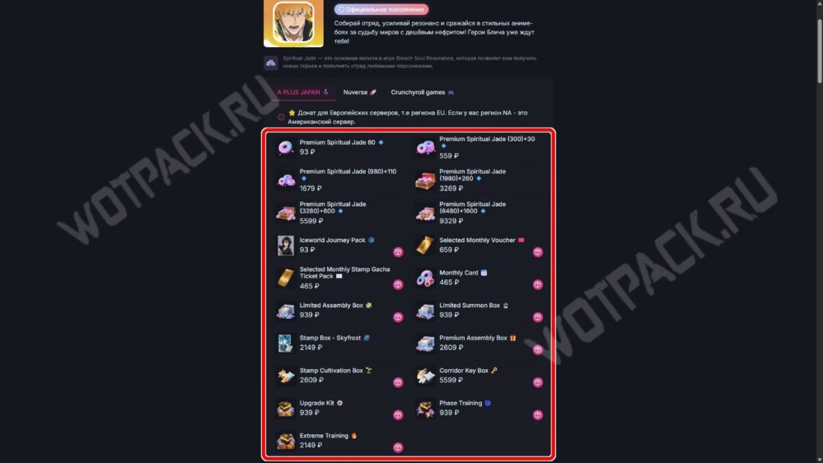 Официальная покупка премиальной валюты осуществляется через мобильные сервисы Google Play и App Store, но попытка совершить транзакцию из России будет безуспешной — мобильные магазины приложений не принимают платежи по российским картам. Однако выгодный донат в Bleach Soul Resonance доступен с помощью сервиса Donatov.net.
