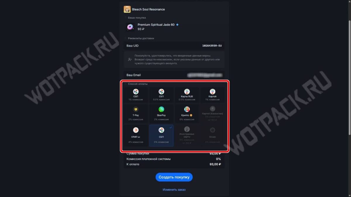 - При оформления покупки убедитесь, что верно ввели данные, укажите Email, а затем выберите одну из доступных платёжных систем (СБП, карта или криптовалюта).