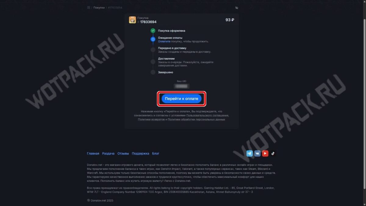 - После нажатия кнопки «Создать покупку» окажетесь на странице заказа, где отображается прогресс его выполнения. Ещё раз проверьте UID и нажмите «Перейти к оплате».