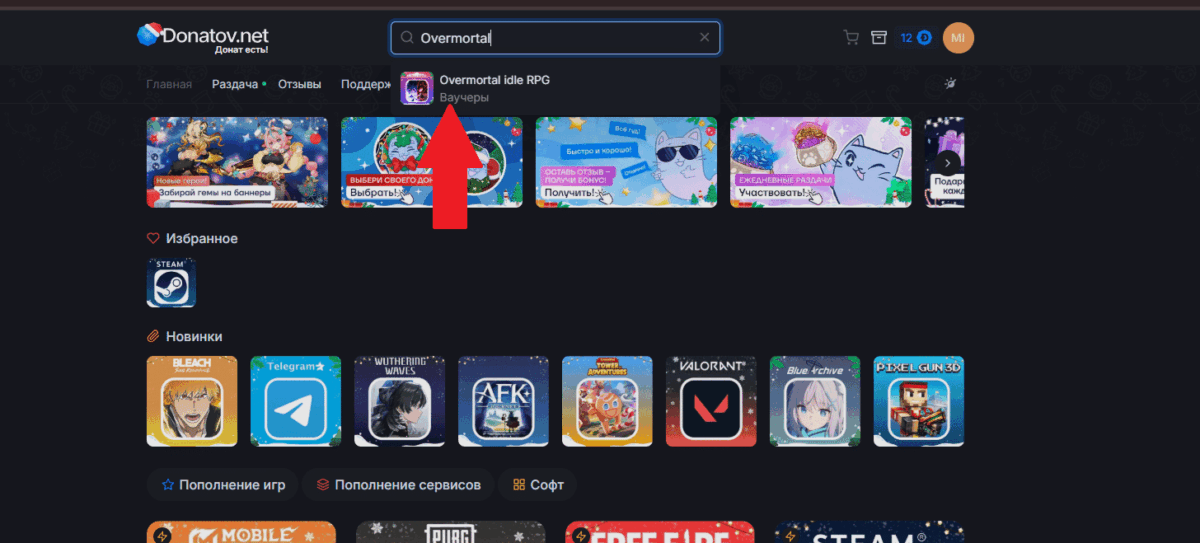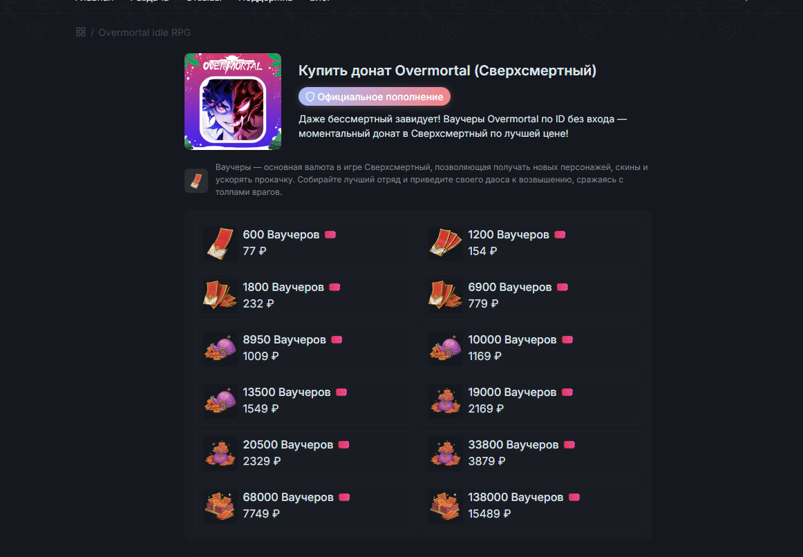Одним из самых выгодных способов купить ваучеры в Overmortal является платформа donatov.net. Сервис — официальный партнер игры, поэтому пополнить баланс быстро и безопасно можно по ID игрока. Для этого следуйте простой инструкции: